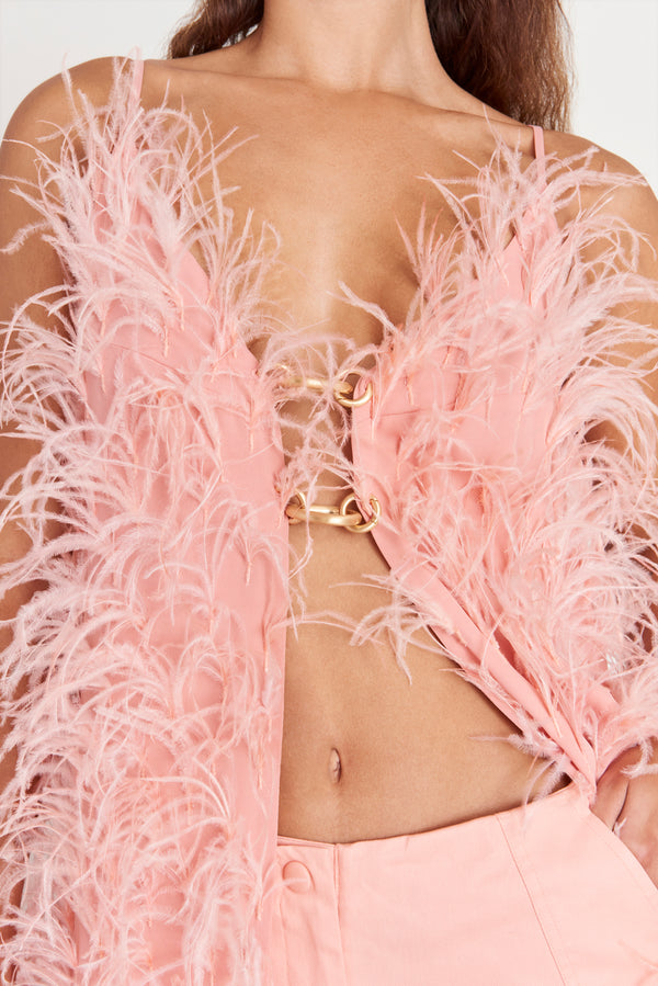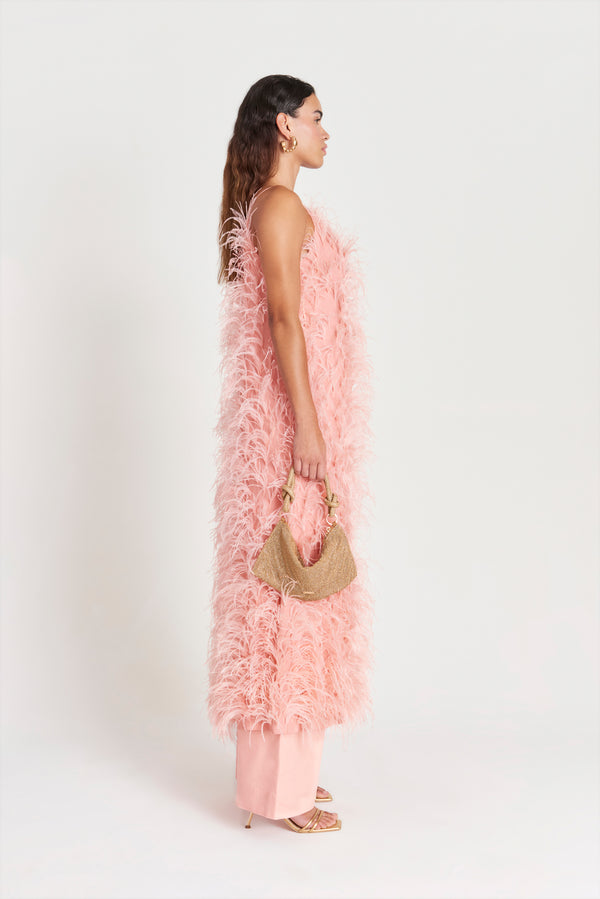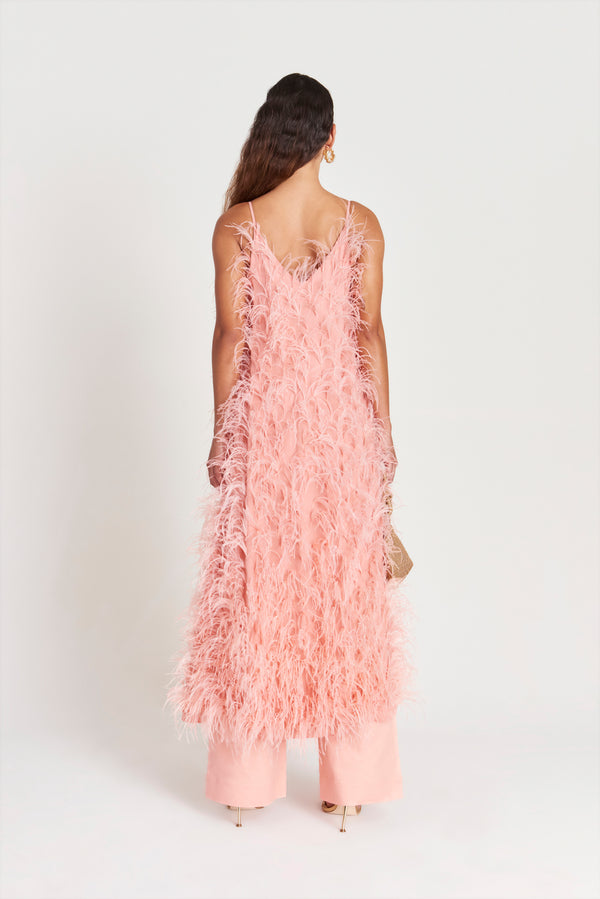Model is 5'10.5" and is wearing a size Small Embroidered feathers Double georgette fabric Functional metal hardware Longer mini length Extension for straps No sliders at straps 100% Silk, 100% Ostrich Feather |