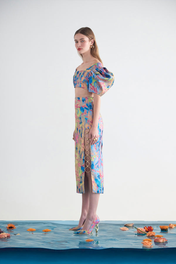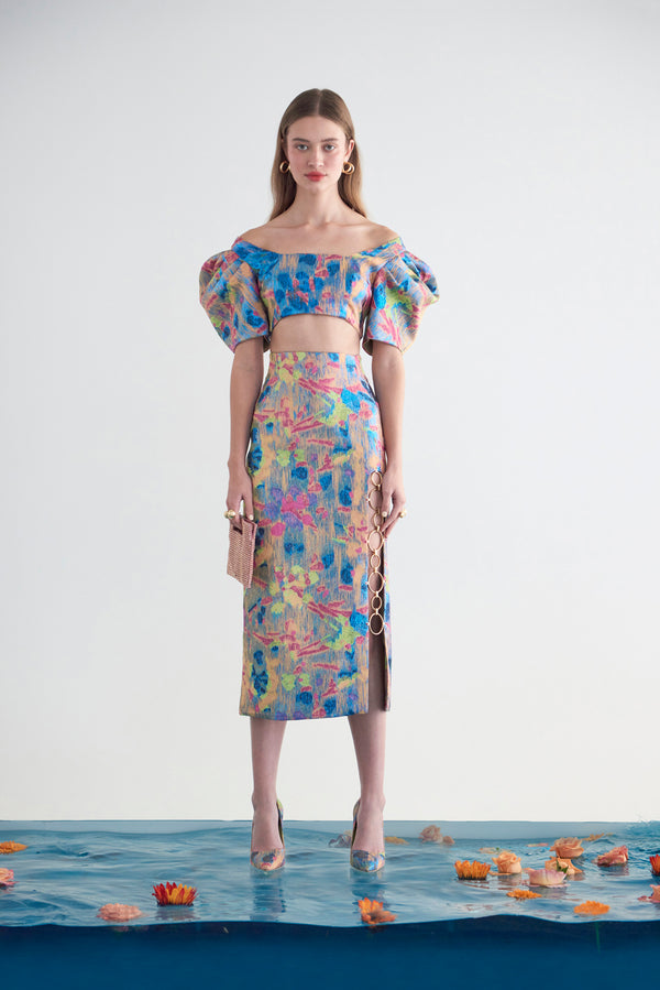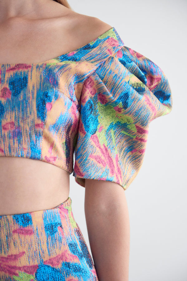 <\/strong> Fit Notes CroppedPuff sleeveCenter back zipperLined Composition and Care 52% Polyester, 20% Acetate, 19% Cotton, 9% Metallic Yarn
