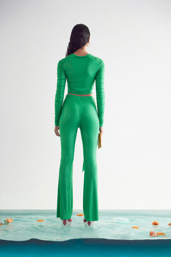 Fit NotesModel is 5'9" and is wearing a size Small Hotafix rhinestone embellishment Wrap-style top Ruching at sleeves Cropped Unlined Stretch jersey Composition and Care82% Nylon, 18% Spandex |